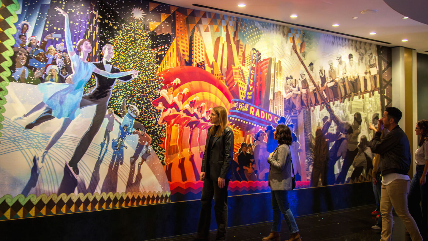 Upon arrival, guests are immediately treated to over 304 linear feet of hand-painted murals designed by Sally Wern Comport that pay homage to the Art Deco style of Rockefeller Center.