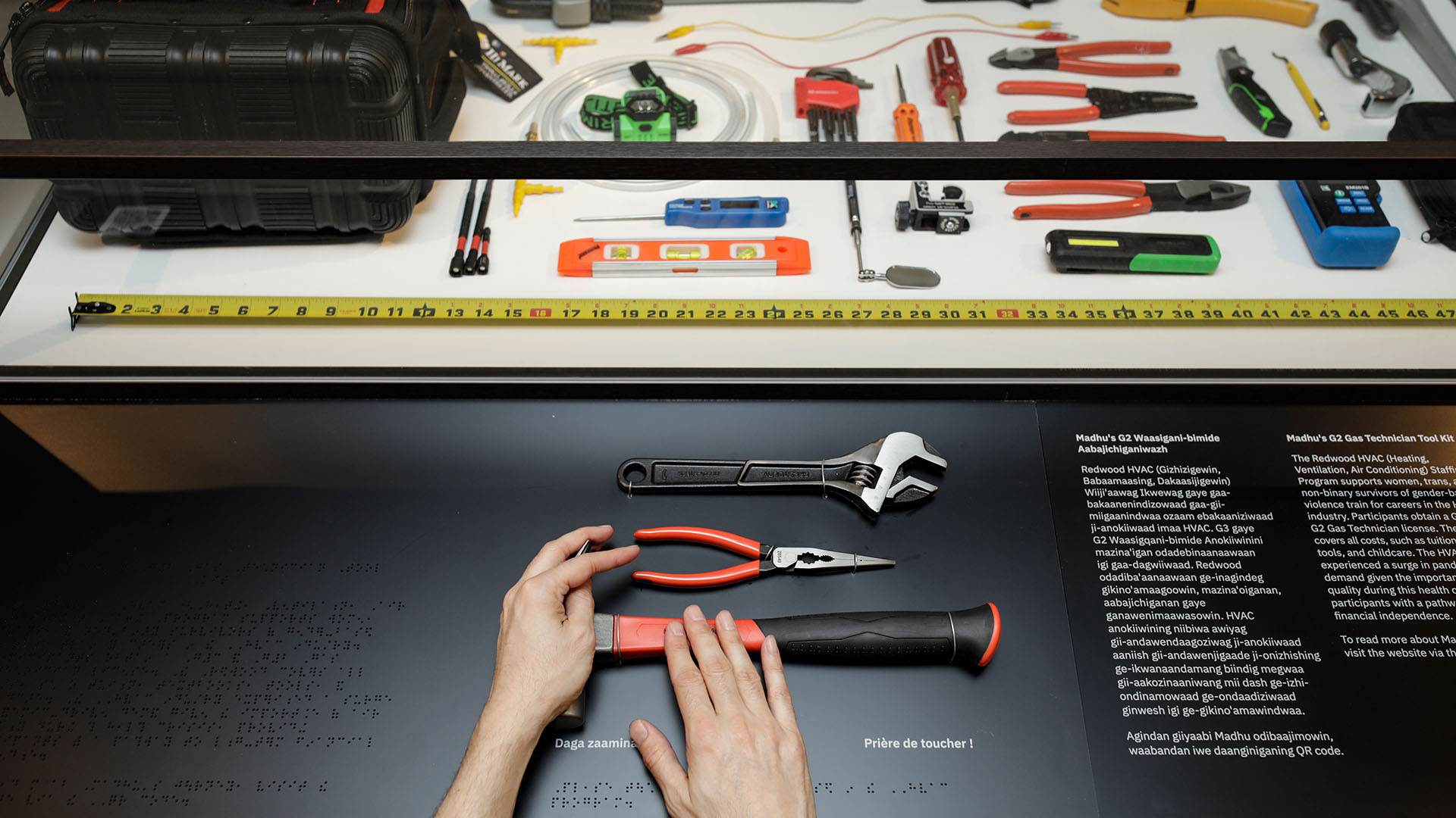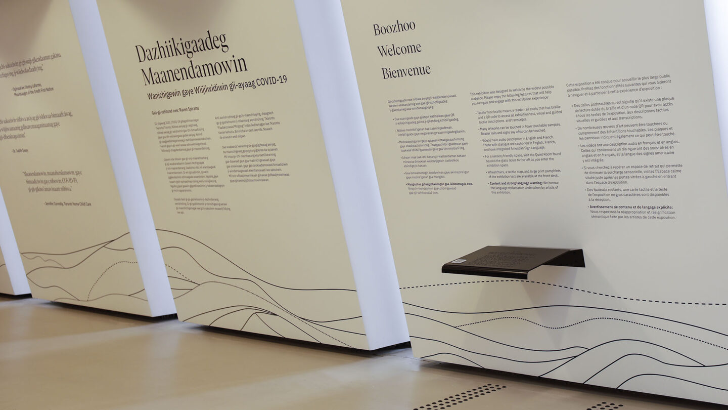 The project was designed and executed with a focus on inclusive access across all facets of the visitor experience. Content was carefully developed with attention to reading level, anticipated dwell time, and cultural translation, including translation between Anishinaabemowin, English, and French. Presentation strategies accounted for in situ, online, and collateral formats, incorporating graphic design that addressed size-to-distance readability, viewing angles, visual hierarchy, and color contrast ratios. Accessibility features were integrated throughout, including Braille on all text panels, high-contrast graphics, tactile maps, ASL interpretation, captions, audio description, text-to-speech functionality, and zoom capabilities. Artefacts were also enhanced with touch affordances to support multimodal engagement.