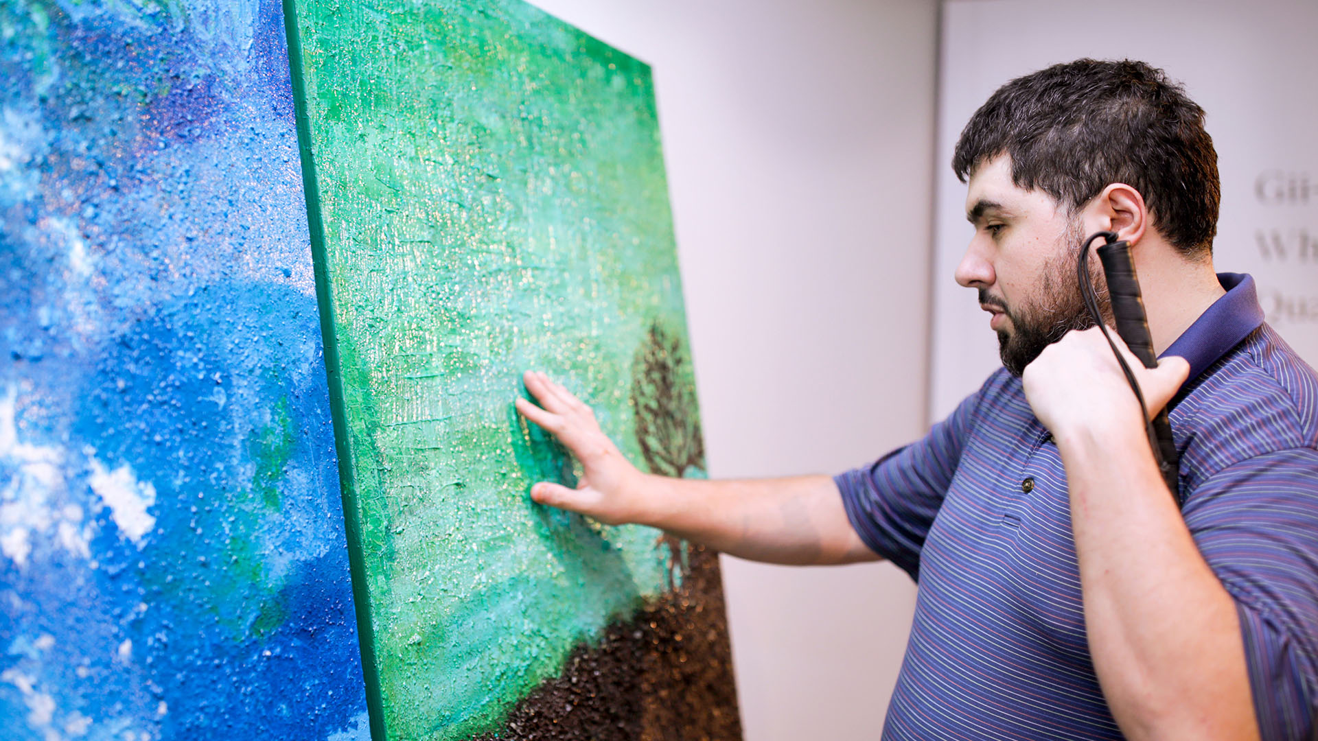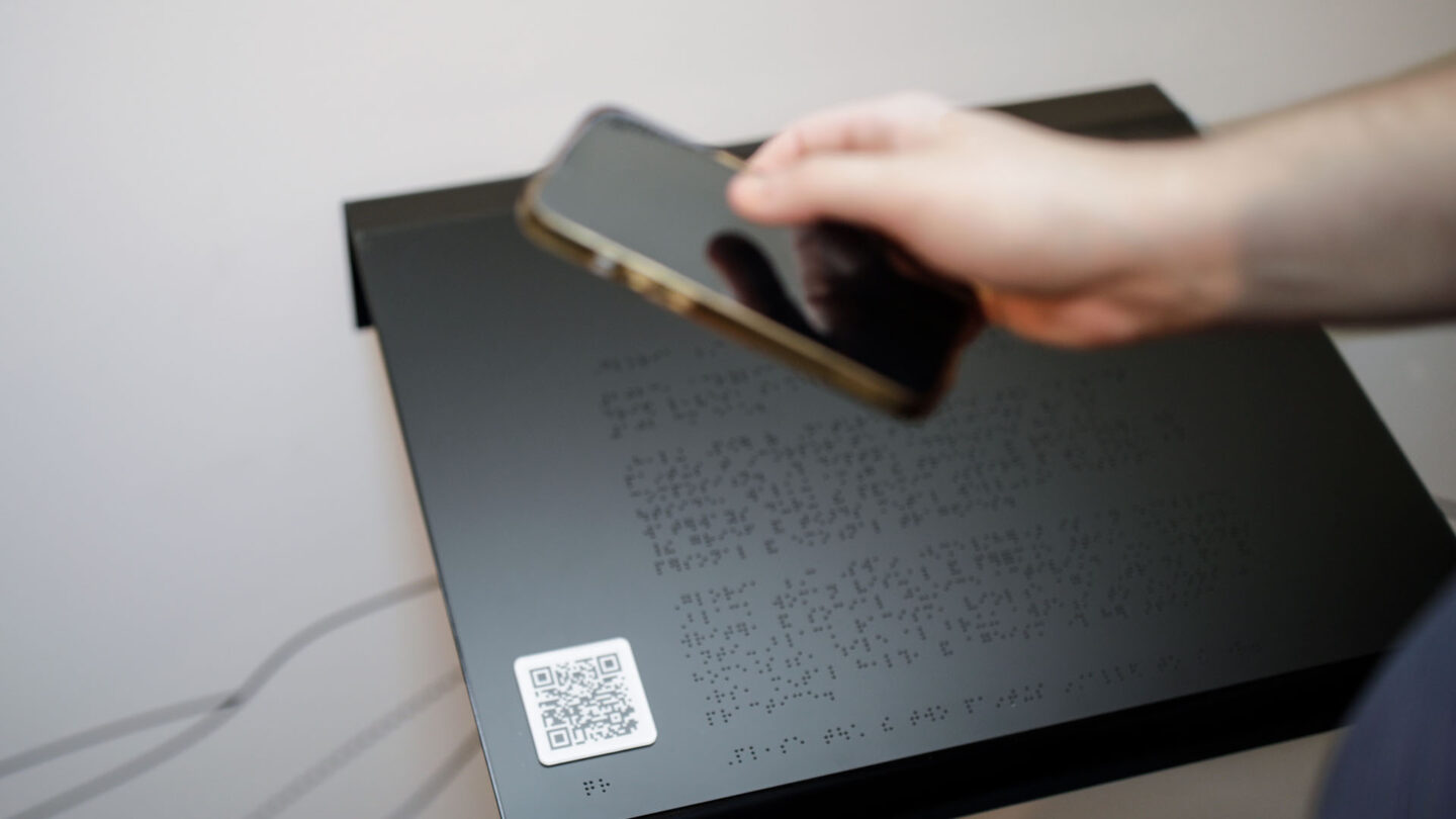 A close up of a blind user autonomously using the tactile QR code, sitting on a reader rail containing braille, to access visual description information of this installation’s corresponding artwork.