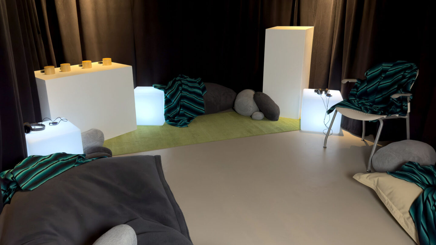 The mixed media installation is touchable and provides various seating features, including arms, backrests, adjacency spacing for chair users, and incidental seating without armrests for transfer seating.
