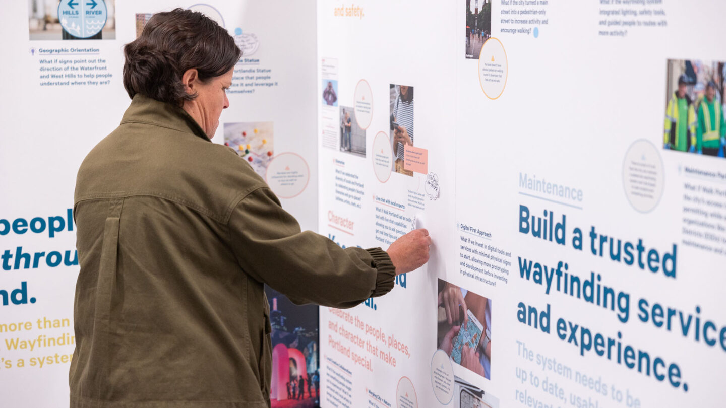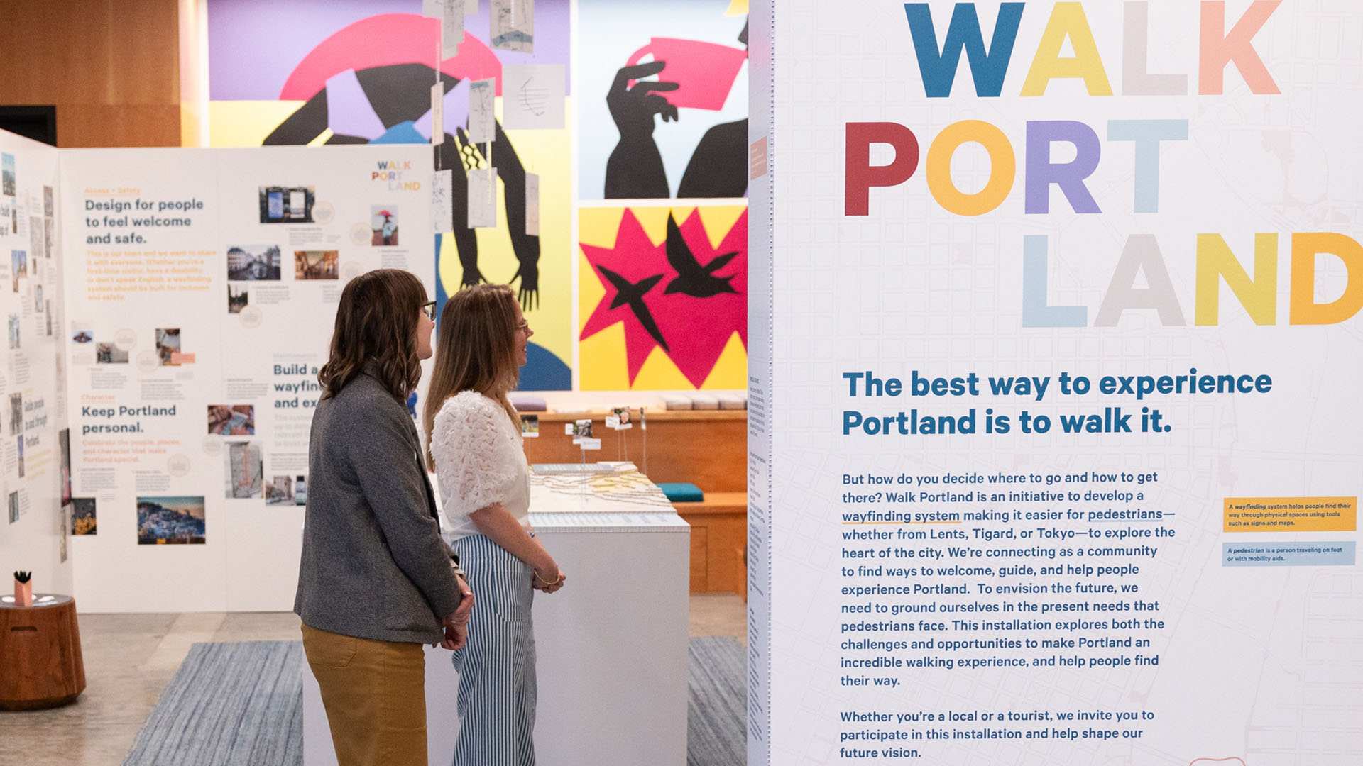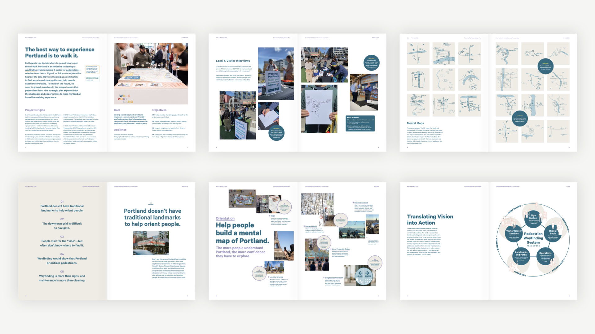The best way to experience Portland, Oregon is to walk it. But how do people decide where to go and how to get there? Walk Portland is an initiative by Travel Portland, the Portland Bureau of Transportation (PBOT) and (redacted) to develop a wayfinding system to make it easier for pedestrians­—whether from Lents, Tigard, or Tokyo—to explore the heart of the city. This project represents Phase 1: a strategic plan for a comprehensive wayfinding system. Before designing and installing wayfinding tools, we wanted to connect as a community to find ways to welcome, guide, and help people experience Portland. To envision that future, we grounded ourselves in the present needs that pedestrians face, using human-centered design methods and community engagement strategies.  The next phase, piloting the system, will take place in 2025, followed by implementation beginning in 2026.