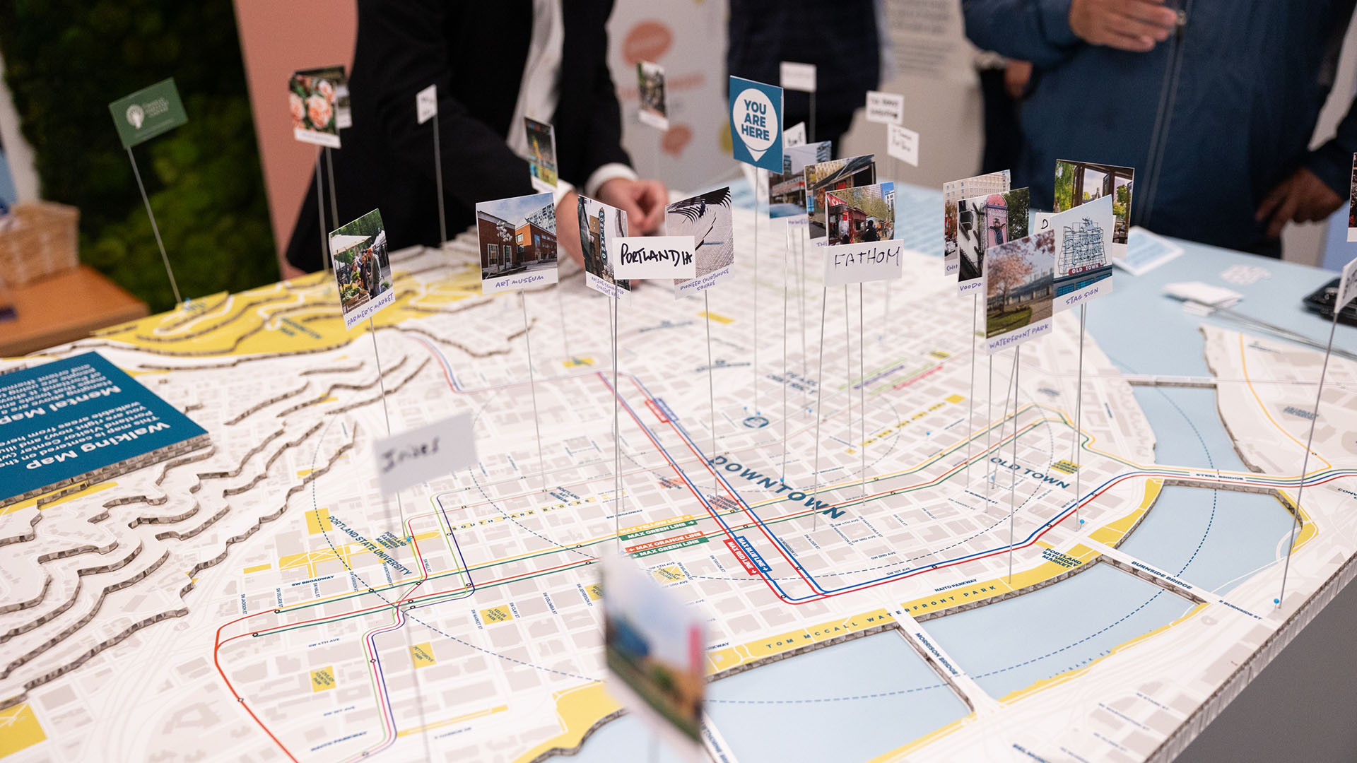A table-top map of downtown Portland invited people to share their favorite landmarks and destinations.