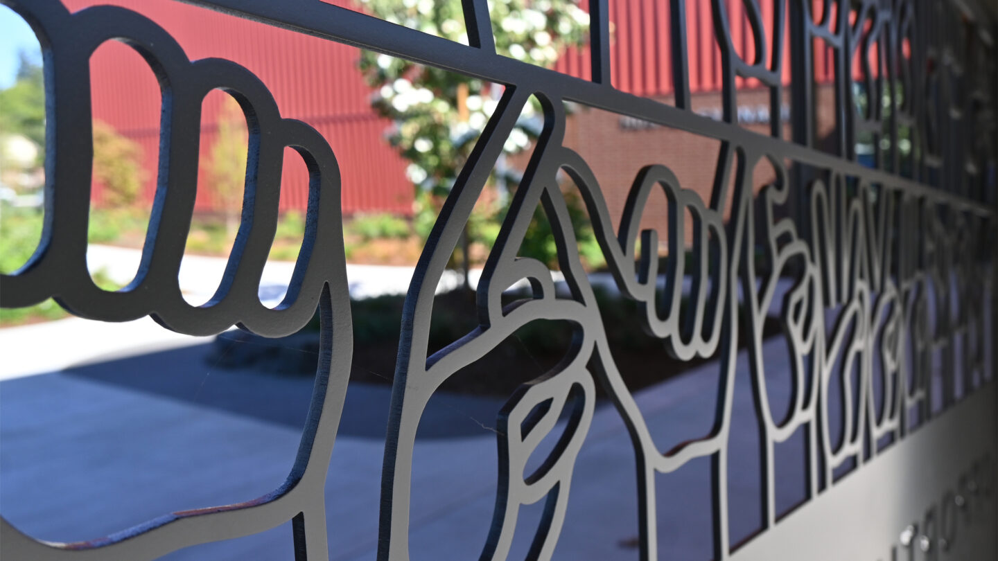 Many patterns were studied, but it was the overall tracery of ASL letterforms that resonated with the school, expressing the lifeblood of learning that takes place there. Next, the various ASL alphabet styles were refined into linework that could maintain the structural integrity of the gate and have enough rigid connection points without loose prongs or hooks. This required drawing each letterform, sometimes using the designer’s own hand as a model. Collaboration with the laser cutting fabricator was critical, with samples tested during the process. The final solution expresses the school’s values beautifully while providing functional security and has become the icon of the revitalized campus.