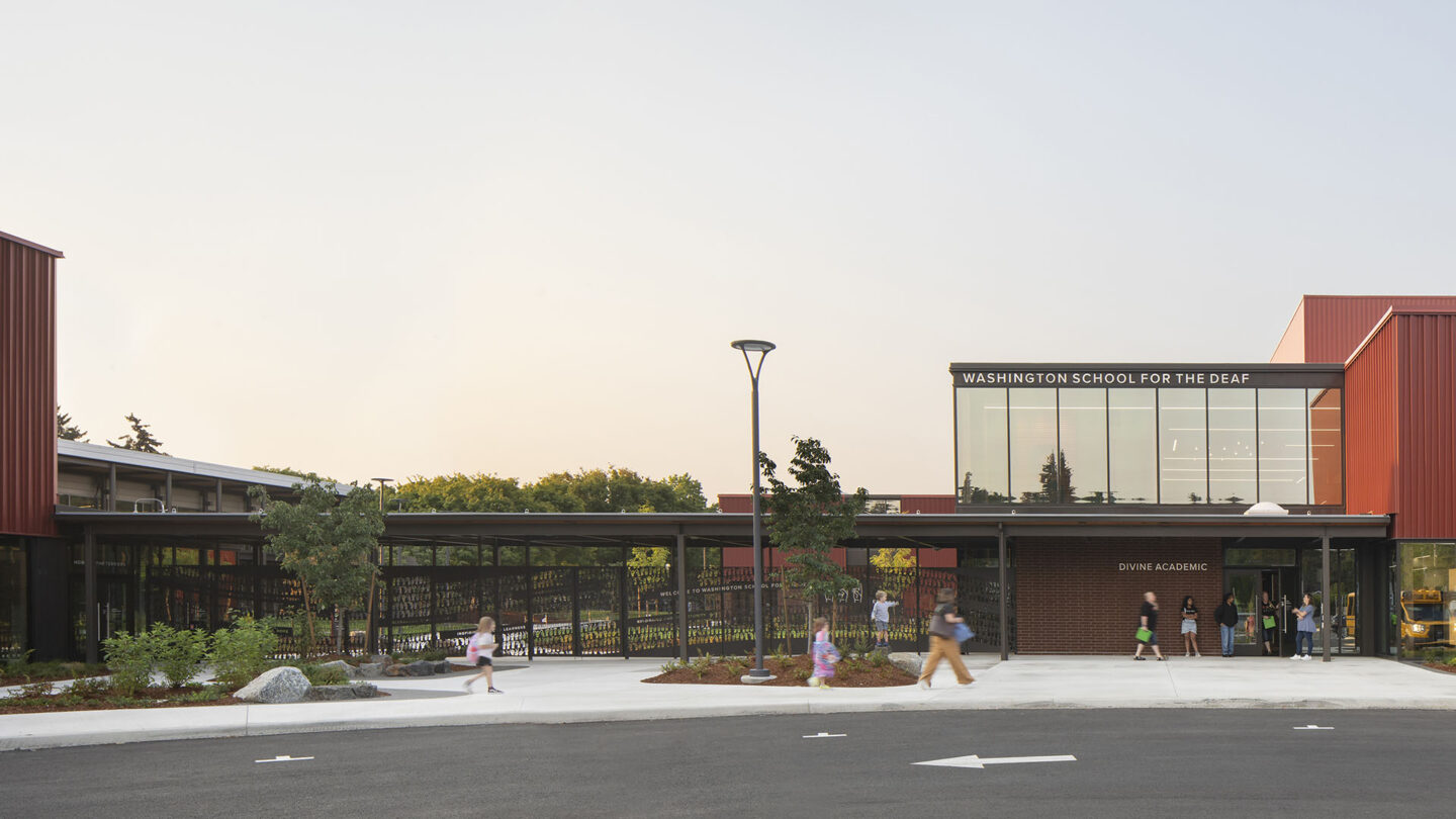 Washington State School for the Deaf (WSD) is a state funded ASL-English bilingual school serving deaf and hard of hearing students in Pre-K through 12th grade from around the state in a residential and traditional education program. The new Divine Academic Building and Hunter Gymnasium anchor a central campus redesign which modernizes the historic campus and opens it toward the surrounding community.