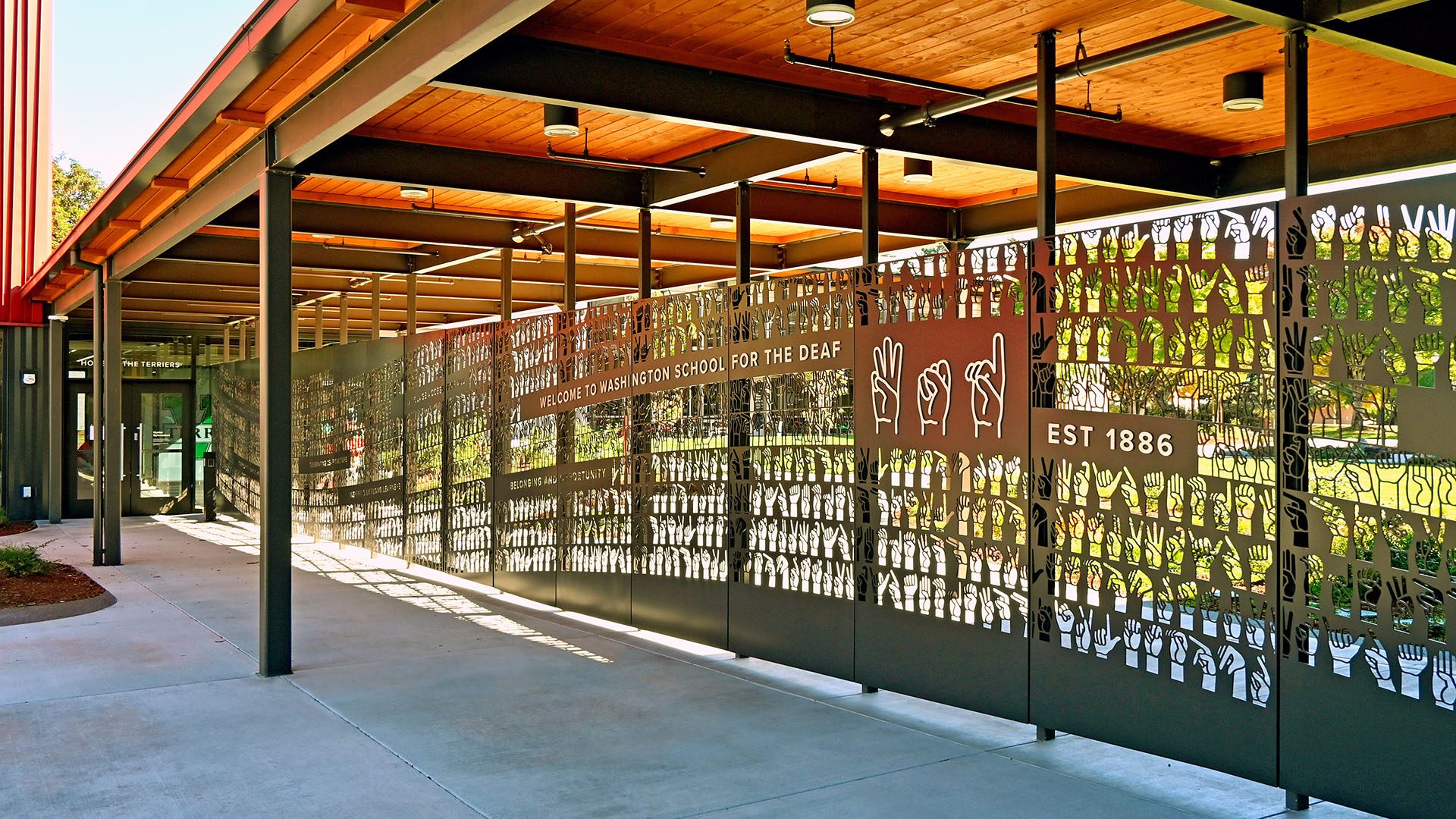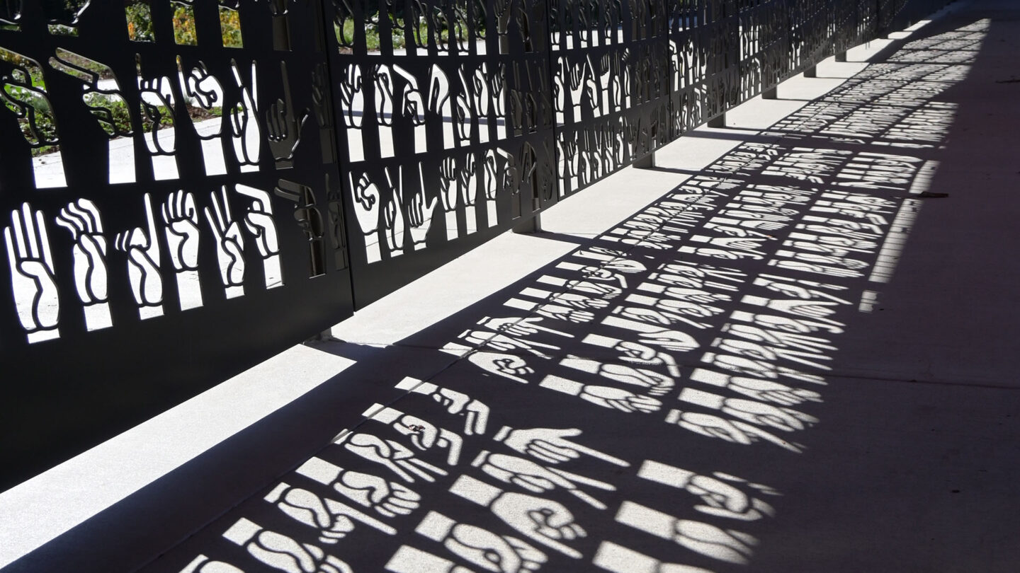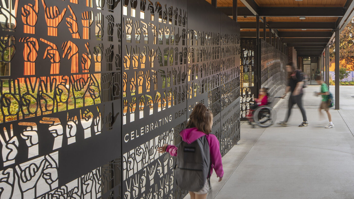 The finger-spelling alphabet of the American Sign Language—a language of motion and gesture—flows across the gate panels. Excerpts from the school’s mission; “Bilingual, Empowered, Successful for Today and Tomorrow,” “Celebrating Deaf Culture” and ”Language Access for All” greet the community with a bold commitment to the school’s mission.