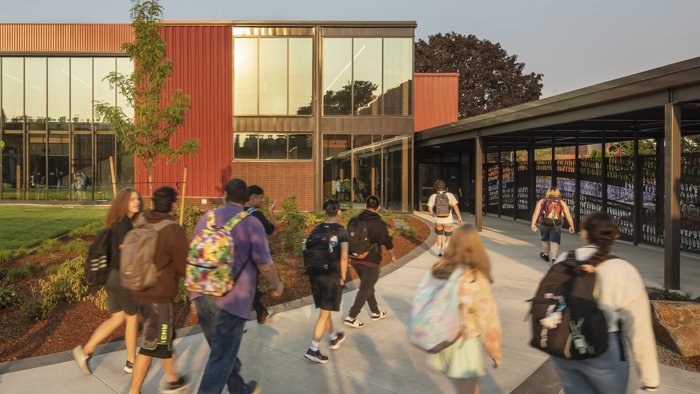 The new focal point of the main entrance, an iconic art gate, represents WSD’s values while providing transparent security for the heart of campus. Spanning the two new buildings, the art gate is visible upon approach from the parking and drop-off area. From the campus interior, the gate provides a sense of safety without feeling confining.
