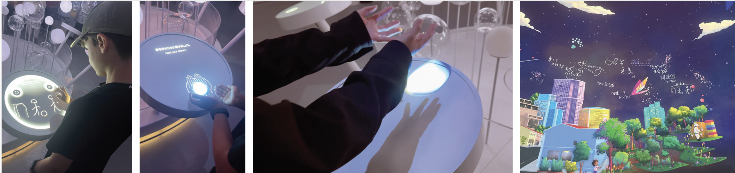 Visitors have an individual station and are prompted to draw their dream, then hold their dream, and carry their dream to the center of the installation, in an upward motion akin to releasing a bird or butterfly, where it is picked up by glowing lights and carried to the collection of dreams on the domed ceiling in the next area. The combination of hand tracking, timing, projection and lighting was skillfully executed by the design team. The gesture of holding the projection with two hands clasped together is perhaps not a familiar gesture to most; however, a simple line drawing on the display and watching visitors at the adjacent stations making the clasped hand motion and releasing into the center of the activity became familiar to people. When asking multiple staff members if they often needed to step in to assist people with this unfamiliar gesture, they said rarely, indicating it was easy to learn, and the interfaces were intuitively designed to meet people across cultures, abilities and ages.