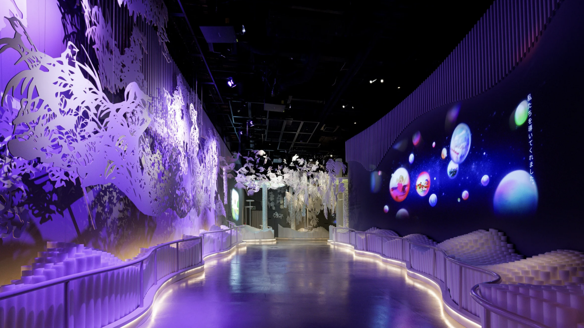 Entering the sphere, visitors were immersed in a lush, dream-like landscape with cut paper installations and topographical forms. The experience then unfolds in Chapters. The entire space is immersed in dramatic layers of cut white paper of plants and animals, interwoven with bridges and skylines, emphasizing Singapore’s ongoing dreams to transform into a city in nature by artist Melissa Tan. The installation is entitled, “Paving Paradise.” The artist spent three weeks pre-opening, carefully installing the cut paper installation piece by piece. The first area of Chapter One is brought to life by a ten meter animation by artists Jerrold Chong & Mark Wee, who were inspired by the Paul Klee quote, “A line is a dot that went for a walk,” expressing the imagination and artistic freedom represented in the experience ahead.