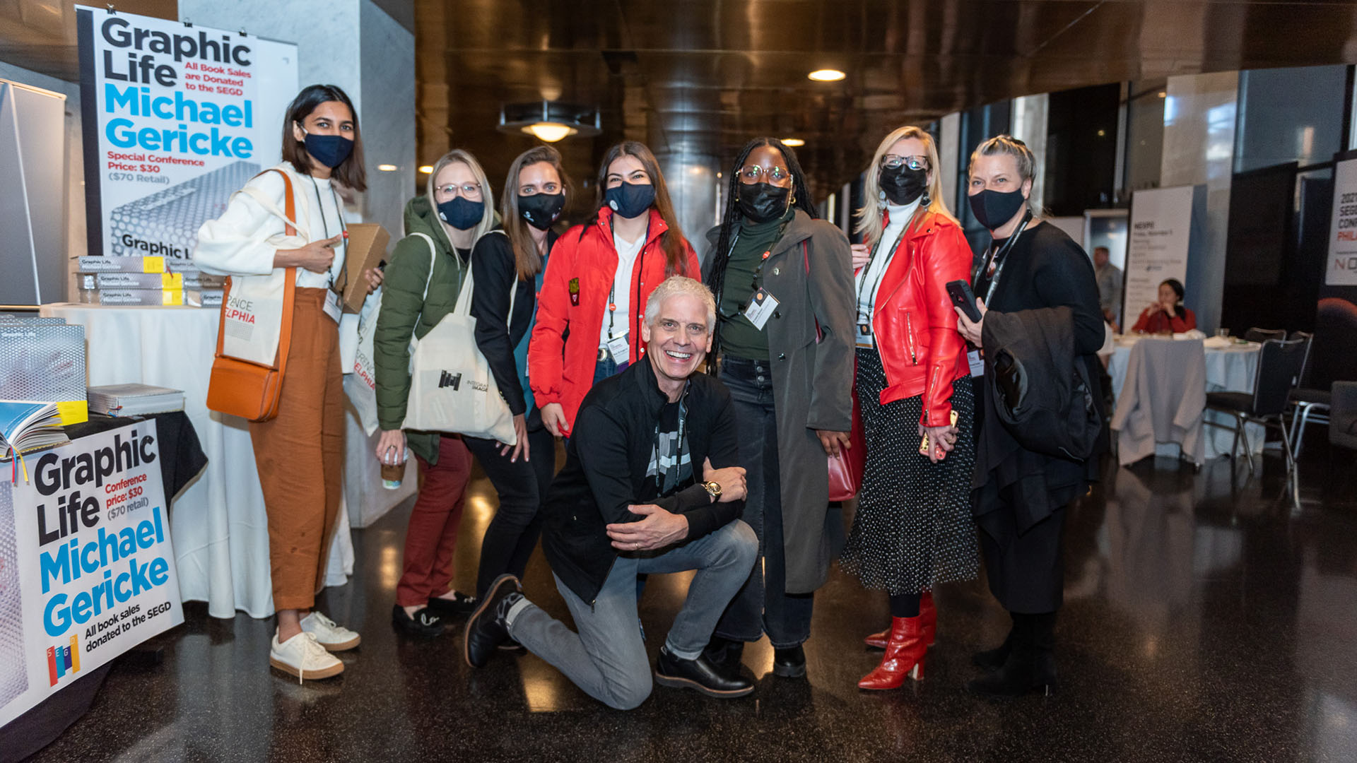 Michael Gericke kneels beside a group of young designers at the 2021 SEGD Conference Experience Philadelphia